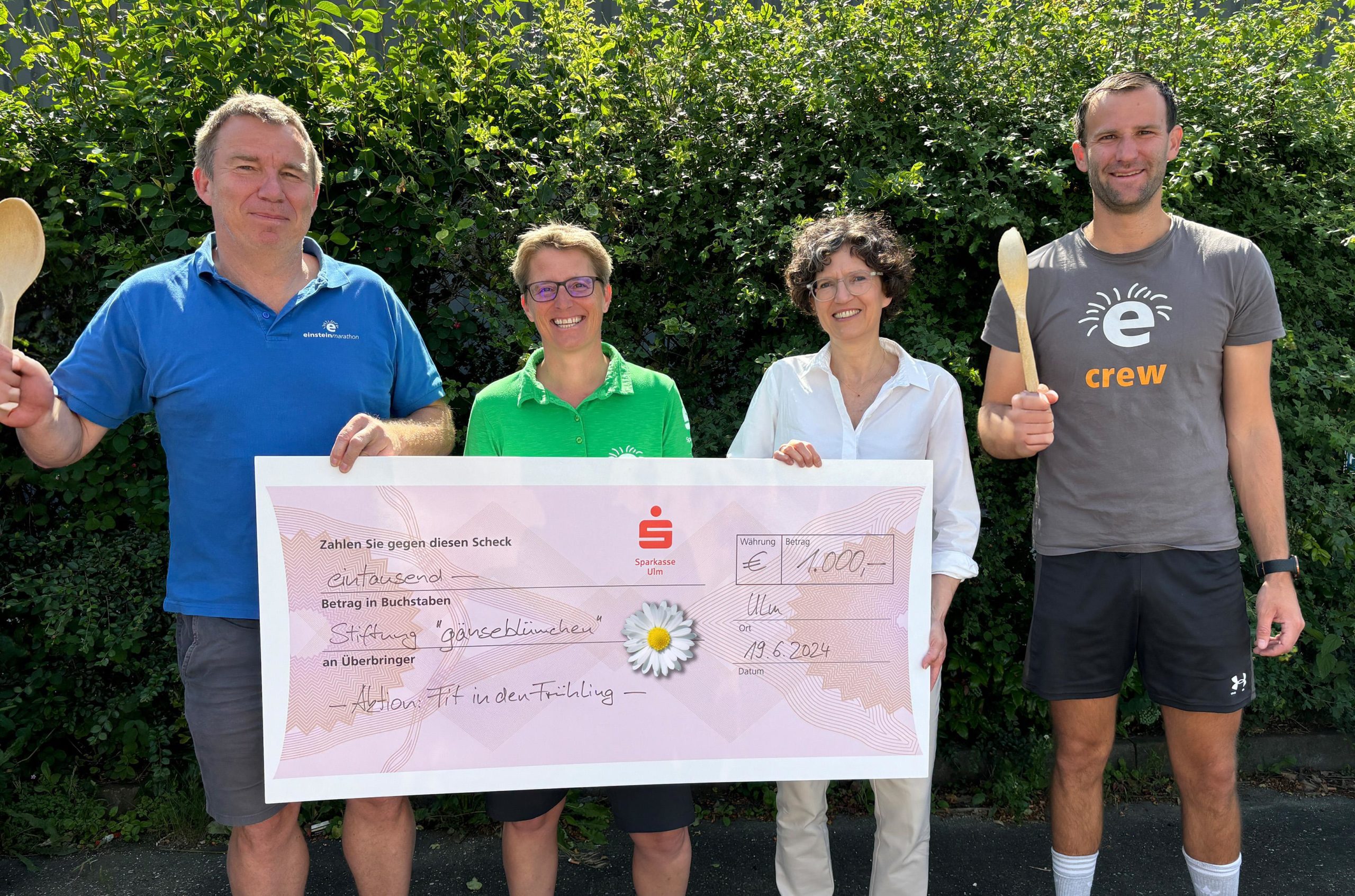 Zusammen mit unseren Sponsoren, dem ASC Ulm/Neu-Ulm ‘011 e.V., und den Teilnehmenden konnten wir letzte Woche der Stiftung gänseblümchen, insbesondere dem Projekt “Coole Küche”, einen Scheck in Höhe von 1000 € im Rahmen der Aktion “Fit in den Frühling” überreichen. Mit dieser Spende unterstützen wir die “Coole Küche” der Stiftung gänseblümchen, die Kindern aus der Region Ulm/Neu-Ulm durch gemeinsames Kochen zeigen möchte, dass gesundes Essen lecker schmeckt und leicht zubereitet werden kann.